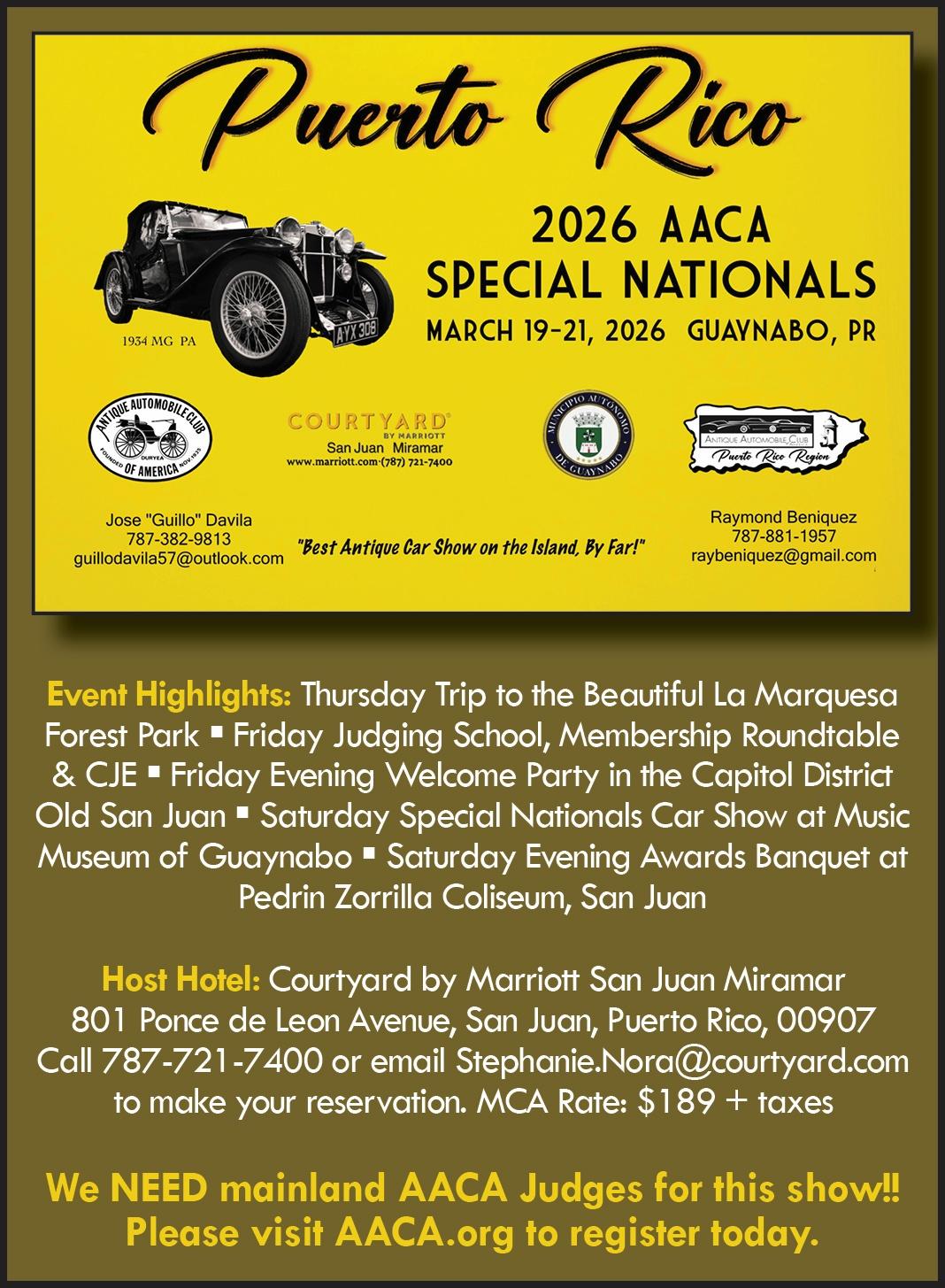 If you have never been to Puerto Rico, now is your chance – especially if you are an AACA Judge. We NEED mainland AACA Judges for this show!!