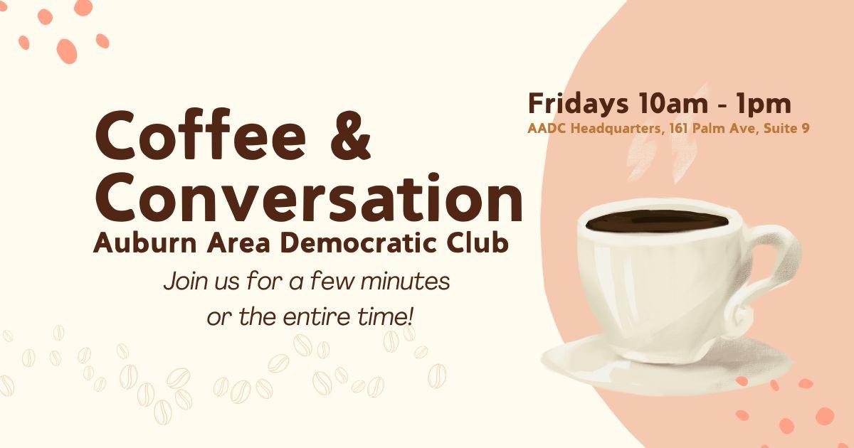 Fridays, 10am – 1pm: Coffee and Conversation with Auburn Area Democratic Club (AADC), 161 Palm Ave, Auburn. Details here