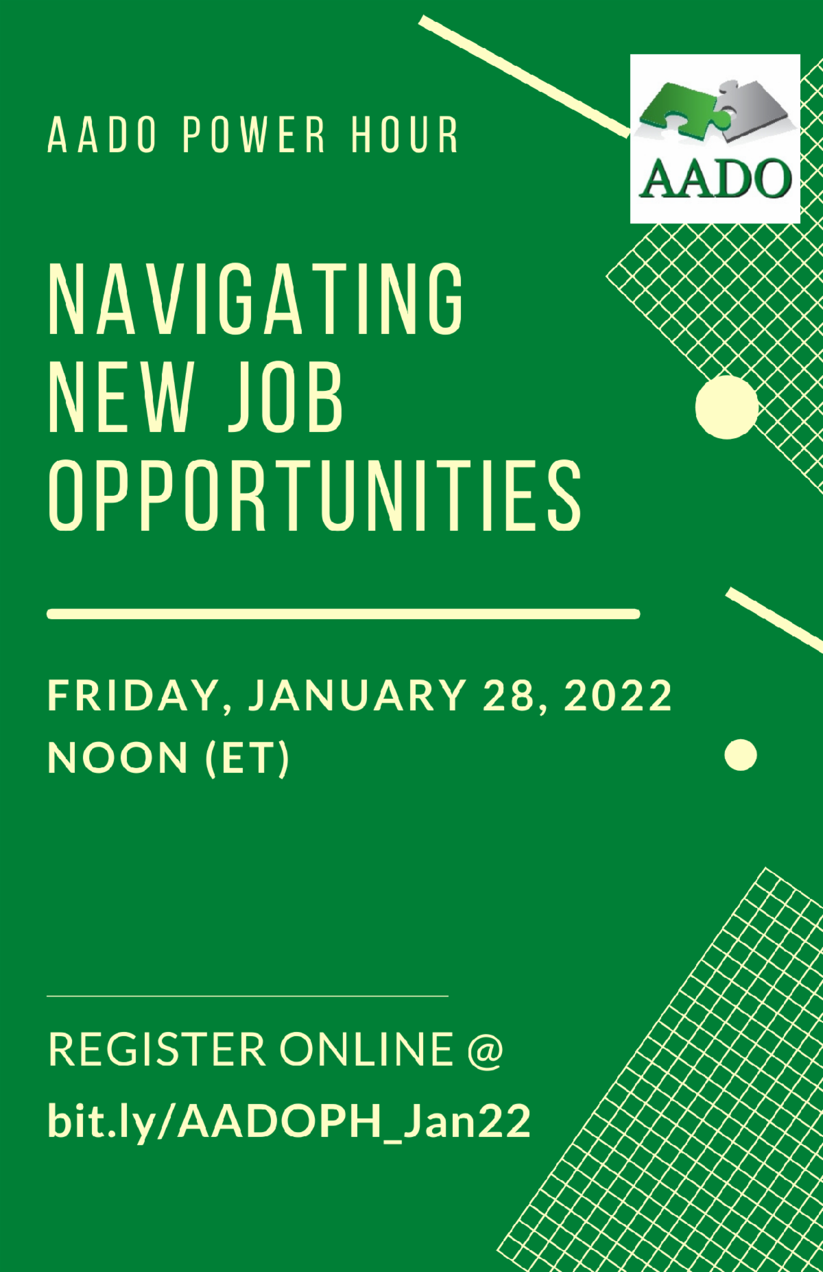 The AADO Jobs Newsletter, which is filled with jobs only, is distributed weekly and includes only new jobs posted since the previous jobs newsletter. Deadline to submit jobs is 5:00 PM EST each Wednesday.