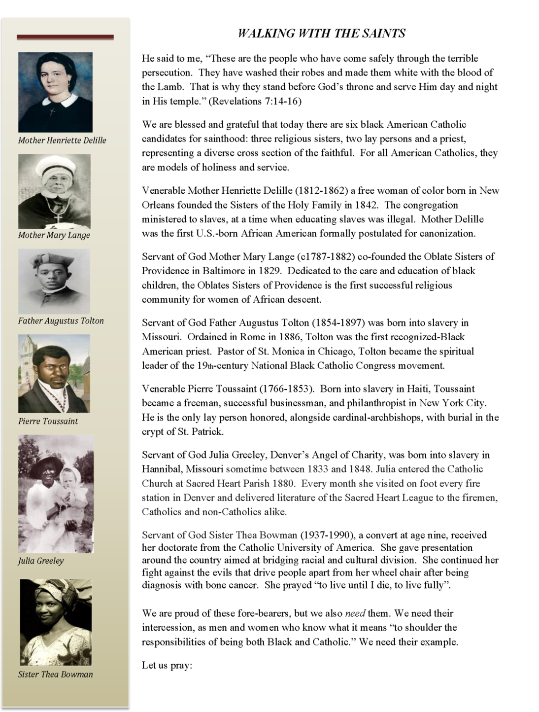 Lord, despite Black Catholics having existed in the U.S. since 1575, there are no Black Catholic saints; the canonization of U.S. Black Catholic saints so that they may “be in that number” is long overdue. Until then, we pray for their immediate canonization to right this injustice, and to reflect upon their lives for personal strength, inspiration, and resolution towards righteous action in the antiracism, racial justice, and broader social justice arenas.