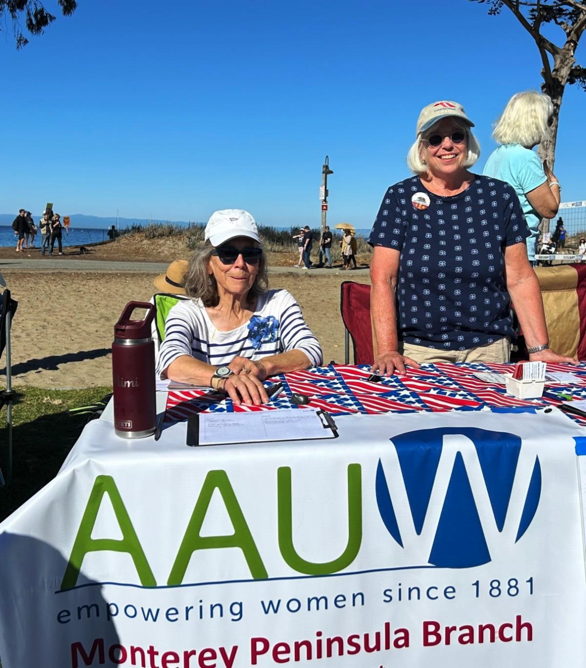 | | On October 18, there was a No Kings Rally at Window on the Bay in Monterey. Our Monterey County Branch had a table there to provide information about AAUW and what we do to empower women and girls. Mary Conway and Pat Fletcher are shown staffing the table. | | | |