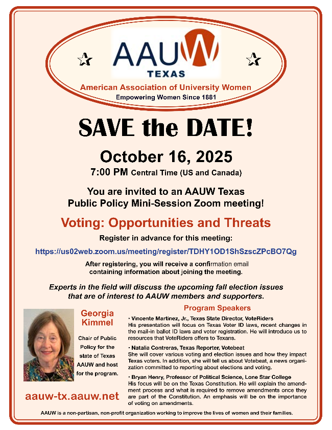 In the second year of the AAUW Texas Biennium, the state asks members/branches for State Bylaw Proposals. All submissions are due to the state by November 15, 2025. Proposals should be submitted via email at: AAUWTXPres@gmail.com.