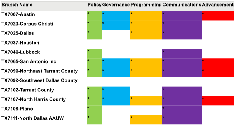 As most of you know, AAUW adopted a new strategic plan and asked state and branches to align with this new vision. At the state board meeting in July, we reviewed the AAUW Texas strategic plan and made significant changes to align Texas with the national vision. In addition to alignment, the goal was to support branches as they work to achieve one, more, or all five stars. You can view the new AAUW Texas strategic plan on the website.