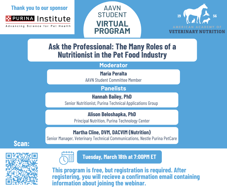 AAVN Student members are invited to an engaging panel discussion exploring the diverse roles that nutritionists play in the pet food industry. Learn from leading experts as they share their unique perspectives and career paths.