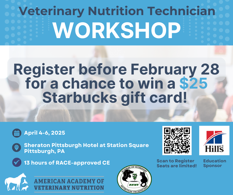 AAVN's first-ever Veterinary Nutrition Workshop for Technicians is happening April 4-6, 2025 at the Sheraton Pittsburgh Hotel at Station Square
