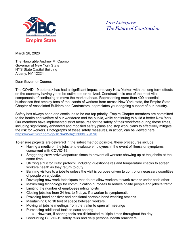 The letter below was sent to Governor Cuomo, New York City Mayor Bill De Blasio and Public Advocate Jumaane Williams regarding calls to halt construction in New York City. Our message is clear: That would be a bad idea.