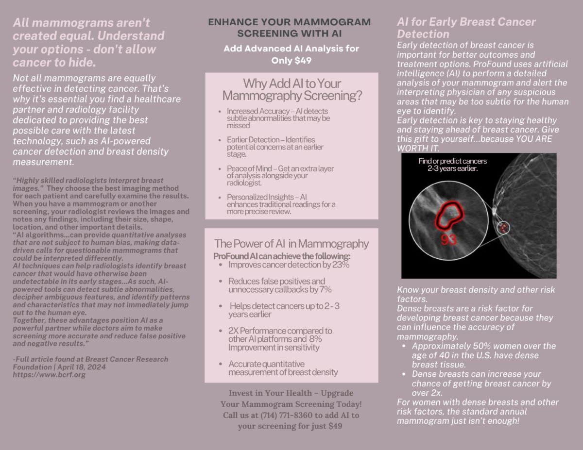 If you’re due for a mammogram—or would like to learn more about adding AI to your screening—we encourage you to schedule your appointment today. Early detection saves lives, and taking this step is one of the most powerful ways to protect your health.