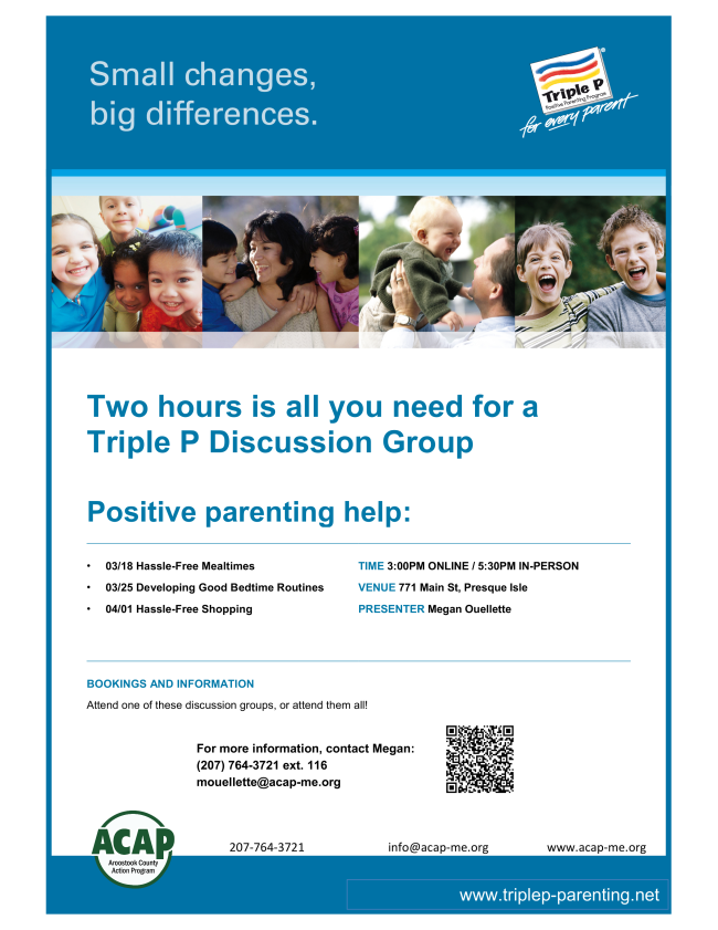 Meetings will physically take place at ACAP's Presque Isle Customer Service Center at 771 Main Street (near Walmart), but families can join remotely if needed! The first planned meeting will be April 2nd from 6:00 pm to 7:30 pm. Attendees interested in attending should send a message to: RSVP@acap-me.org.