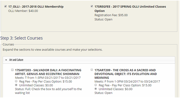 In order to handle USCB's membership options, we needed to extend QuickPick's fee handling feature. You need a basic OLLI membership which lets you register for any of the courses at the, "Pay Per Class," price. As you can see from the screen shot below, courses can now display more than one fee, but the options are pre-selected: