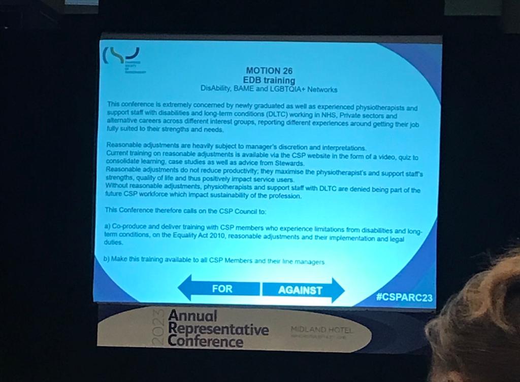 Two of our committee members attended the CSP ARC conference this week, with one of our members, Colette Owen, speaking in support of DisAbility's motion for training the workplace on the Equality Act 2010, reasonable adjustments and their implementation and their legal duties. This motion was carried forward with 100% support!