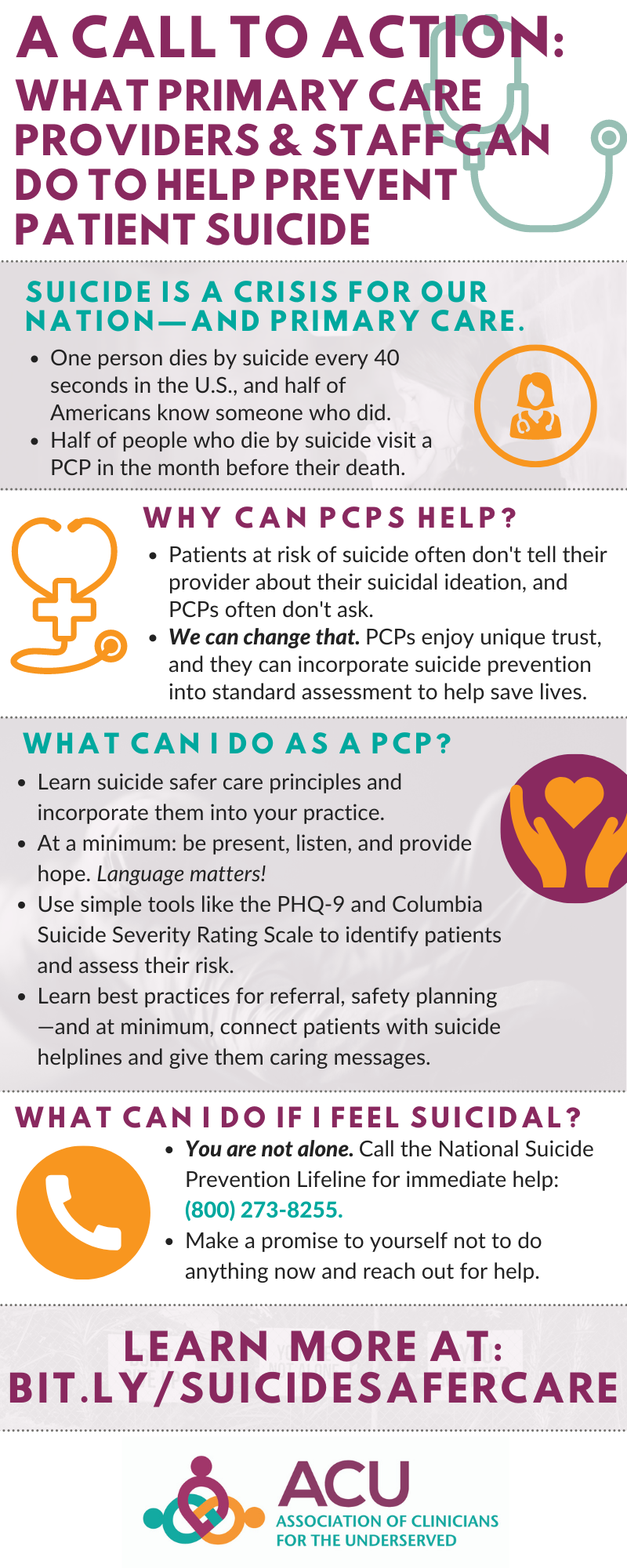 September 5-11 is National Suicide Prevention Week, and this week the Association of Clinicians for the Underserved is highlighting new Suicide Safer Care resources and webinars as we approach our 2021 Conference. Learn about these and other opportunities, including Early Bird registration for #ACUConf, recent self-paced courses and data profiles from our STAR2 Center, new NHSC loan repayment resources, and more below.