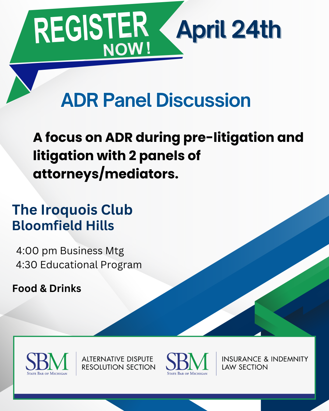 Join us at The Iroquois Club in Bloomfield Hills on Thursday, April 24th, beginning at 4:30 p.m. (Program follows a brief Insurance and Indemnity Section business meeting from 4:00 to 4:30 p.m.) This program will explore ADR processes in both pre-litigation and litigation, featuring two panels of attorneys and mediators, including Donn Fresard, Suzanne Stanczyk, Marcy Tayler, Judges Edward Ewell and Patricia Fresard. Each panel will present for about 30 to 40 minutes. Food and beverages will be provided. Section members - $30, Non-members - $40, Law students - $25