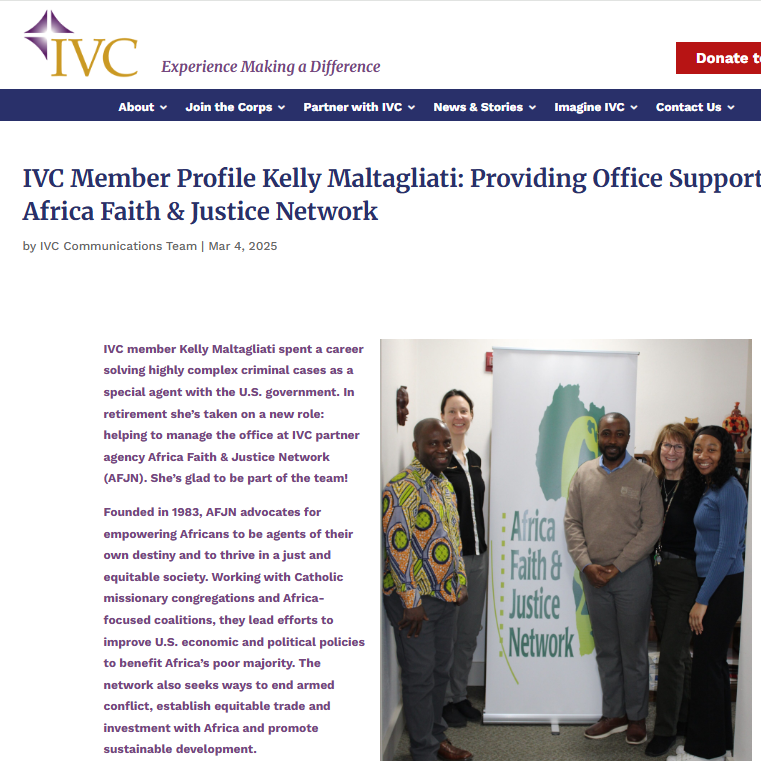 | On March 4, 2025, Ms. Kelly Maltagliati, AFJN Office Manger and Ignatian Volunteer Corp (IVC) Volunteer, was featured in Chris Kelly's article "IVC Member Profile Kelly Maltagliati: Providing Office Support to Africa Faith & Justice Network" in the March issue of IVC Capital Corps Connector. Read it here. | | | |
