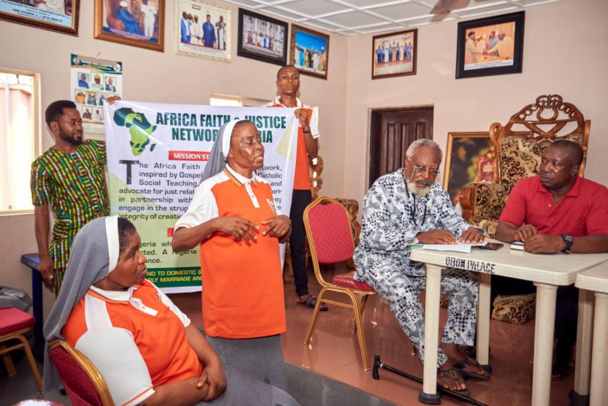 | | Enugu State: In March, AFJN led a delegation to Eze's Palace in the Ndeaboh Autonomous Community, Enugu State, to advocate for an end to early child and forced marriage and domestic servitude. The discussions focused on: fostering community ownership and strengthening child protection systems; implementing a MOU to regulate child placement in domestic service; and promoting cultural reformation and sustainable alternatives. Several key achievements arose from the meeting that included the: MOU adoption to monitor domestic servitude cases; declaration of a state of emergency and commitment by traditional rulers to prohibit early child and forced marriage and domestic servitude; appointment of a gender officer to lead child protection activities; and institutionalizing of child protection measures at the traditional leadership level. | | Lagos State: In March, AFJN held the "Ending Domestic Servitude and Child Labour" training in collaboration with Dominicans for Justice and Peace Lagos State. This was the first training where participants from parishes, Christian and Muslims, nongovernmental organizations, academic institutions, and religious congregations in the Lagos metropolis came together for a weeklong-advocacy training that included visits to state government offices and meetings with key stakeholder to address these issues. | | |