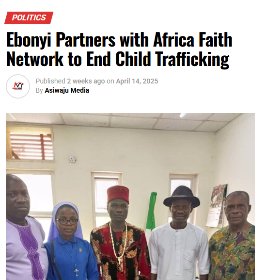 | On April 14, 2025, AFJN's WEP workshop was featured in "Ebonyi Partners with Africa Faith Network to End Child Trafficking" in Asiwaju Media. Read it here. | | | |