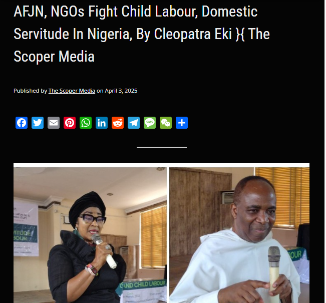 | On April 3, 2025, AFJN's WEP was featured in Cleopatra Eki's article "AFJN, NGOs Fight Child Labour, Domestic Servitude In Nigeria" in The Scoper Media. Read it here. | | | |