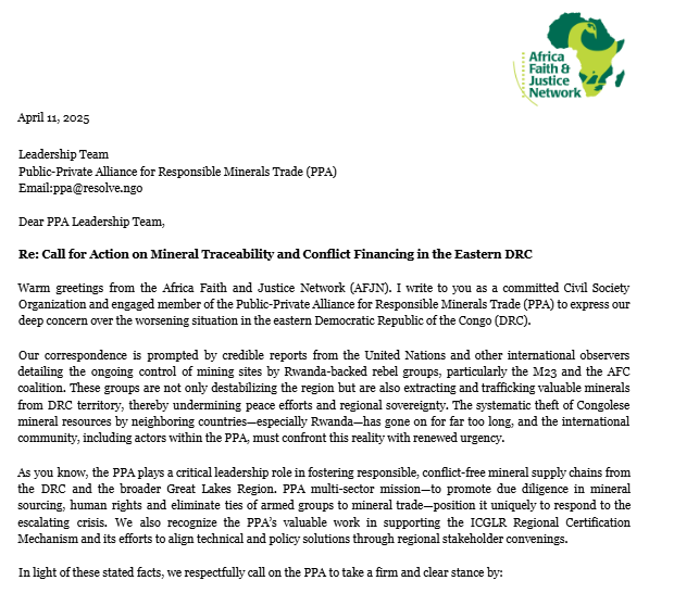 In April AFJN, as a member of the Public-Private Alliance for Responsible Minerals Trade (PPA), sent the PPA Leadership Team a "Call for Action on Mineral Traceability and Conflict Financing in Eastern DRC" letter urging them to take a clear and principled stance on the ongoing crisis in the DRC with particular emphasis on the issue of mineral extraction by unauthorized actors, including armed groups. The letter focused on two reasons: first, that the PPA bears responsibility, as an organization committed to mineral traceability in the region, to provide accurate and transparent data on the destinations of minerals extracted from the eastern DRC, including the identification of intermediaries and end-buyers; second, the PPA’s membership must not remain silent about the realities of due diligence efforts within its network as membership may include companies whose products may contain components sourced from conflict-affected areas.