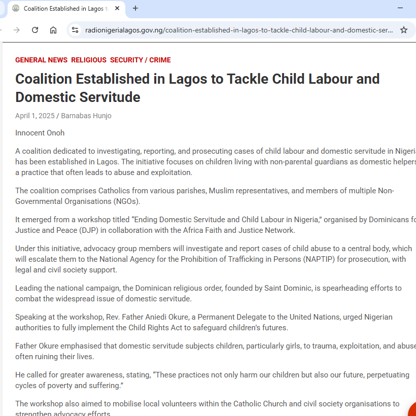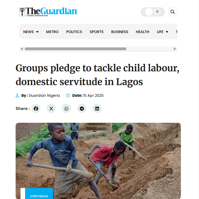 | On April 15, 2025, Cleopatra Eki's article "Groups pledge to tackle child labour, domestic servitude in Lagos" features AFJN's WEP in The Guardian. Read it here. | | | |