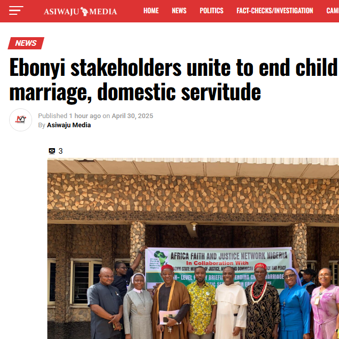 | On April 30, 2025, AFJN's High-Level Policy Briefing was featured in "Ebonyi stakeholders unite to end child marriage, domestic servitude" in Asiwaju Media. Read it here. | | | |