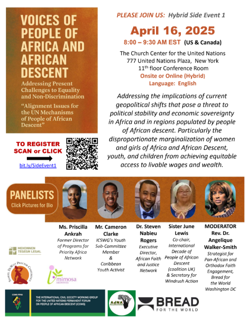 On April 16, Dr. Rogers was a panelist during the "Voices of People of Africa and African Descent: Addressing Present Challenges to Equality and Non-Discrimination” hybrid event sponsored by Mekonnen Tegegn Legal, Samuel DeWitt Proctor Conference, Mimosa Midwives, the International Civil Society Working Group for the United Nations (UN) Permanent Forum on People of African Descent, Advocacy Network for Africa (AdNA), and Bread for the World that was held at the Church Center for the UN in New York.