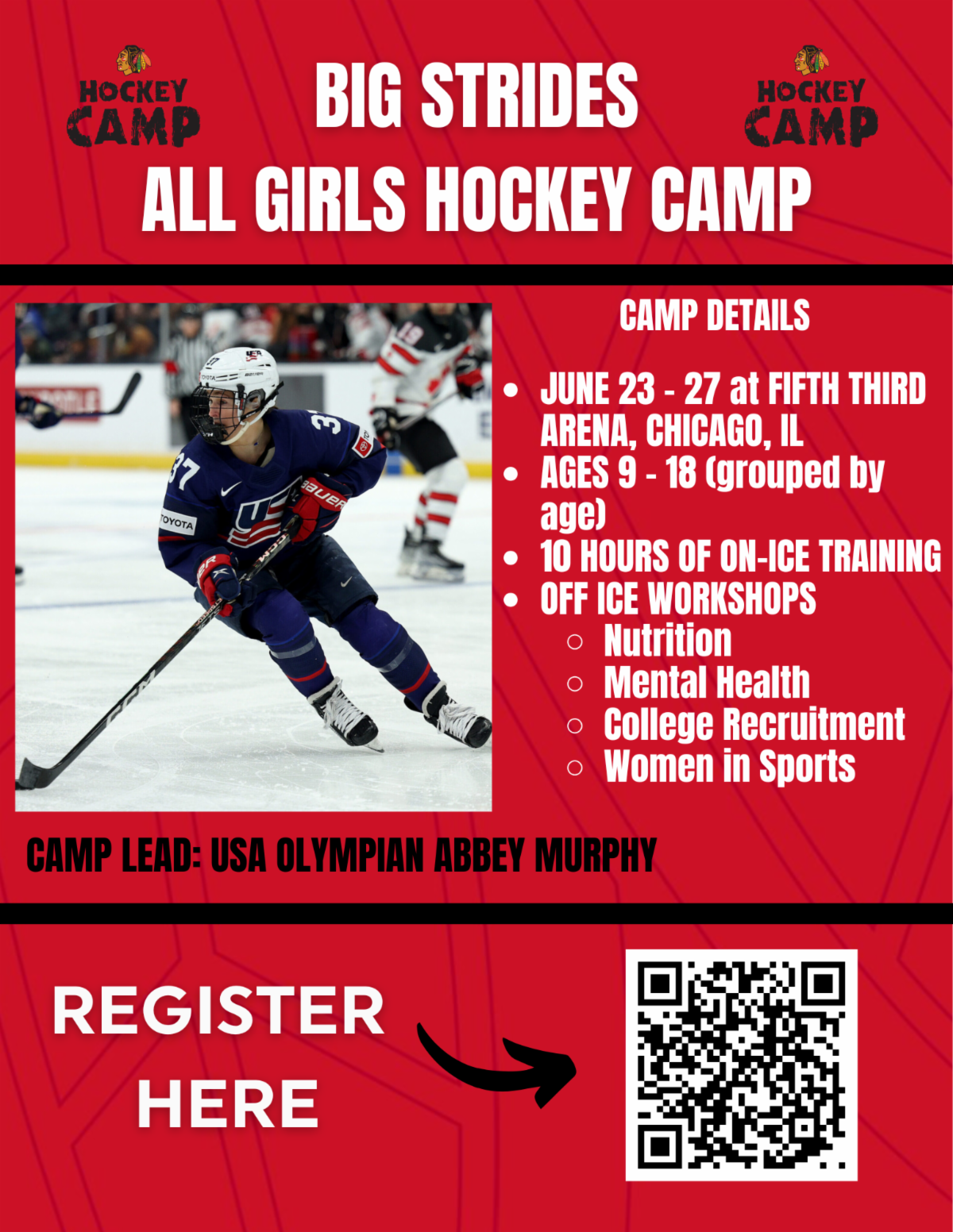 Fresh off winning gold at the IIHF Women’s World Championship, the Blackhawks are proud to partner with Olympic Gold medalist Abbey Murphy for Big Strides, our all-girls camp for girls ages 9-18 taking place June 23-27 at Fifth Third Arena. Abbey will lead all on-ice training, and off the ice, we will provide important information on topics like nutrition, metal health, college recruitment and more!