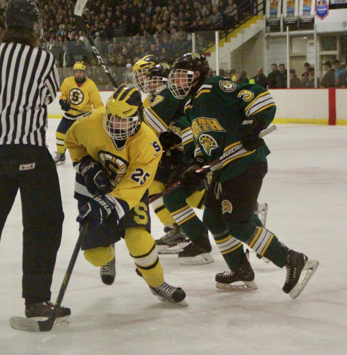 With about 4 minutes to play in regulation-time of the Glenbrook North vs. Glenbrook South High School hockey game played the night before Thanksgiving 2019, South’s Mark Ibarra ripped a shot from the left point to tie the game, 2-2.