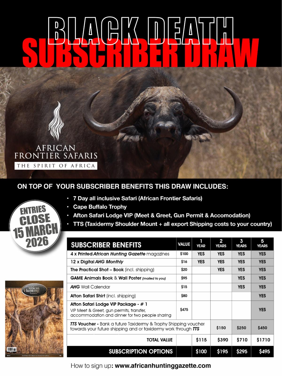 In case you don’t know, we have an incredible all-in 7-day Buffalo safari – hunt, trophy, taxidermy, and shipping in a draw for all subscribers.