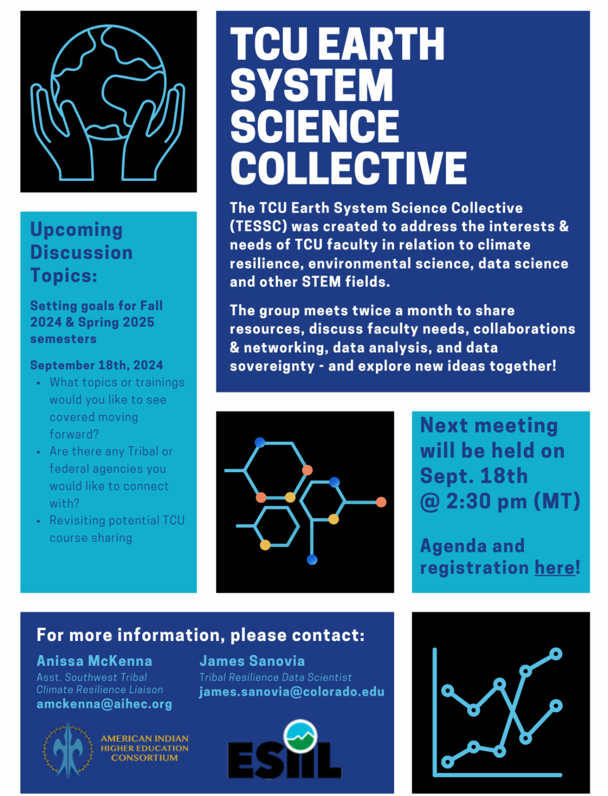 We will be holding a networking session on Wednesday, Sept. 18th from 4 to 5 PM CT for TCU students and faculty from local Tribal colleges and universities to meet and greet the TXG, EPA staff, and other students to discuss student-led projects, environmental data needs, career paths, and EPA-Tribal partnership opportunities. Students will also hear directly from TXG members about their current positions and some interesting projects they are working on with their Tribal environmental departments. Join us earlier September 18th for the Tribal Collaboration session (1:30-2:30 PM CT) and the Workshop on R-Markdown (2:45-3:45PM CT). All conference events are open to students and faculty.