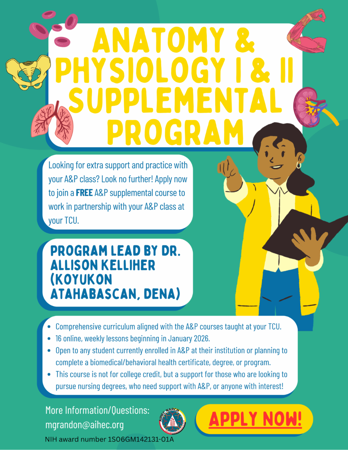 The AIHEC health initiatives team partnered with Dr. Allison Kelliher (Koyukon Atahabascan, Dena), an Alaskan physician, to create a supplemental educational anatomy and physiology program designed for TCU students. The program is specifically for TCU students enrolled in A&P II to work in partnership with A&P II offered at the TCUs, but is open to anyone interested participating. The FREE virtual program begins January 2026 and meets weekly through the Spring 2026 semester. Students can apply directly through the link or be referred to Maggie Grandon (mgrandon@aihec.org) to answer any questions.