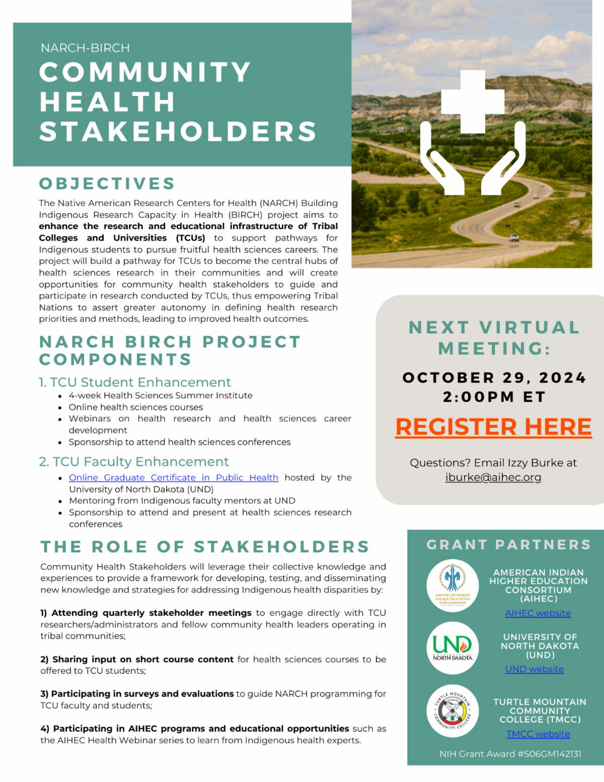 Native American Research Centers for Health (NARCH) Planning grants (PAR-24-041). These grants will support federally recognized American Indian/Alaska Native Tribes, Tribal colleges and universities, Tribal health programs, or Tribal organizations that are not currently funded by NARCH grants to plan and conduct preparatory work for developing competitive NARCH applications. The goal is to increase the reach of the NARCH program and allow more Tribes to participate.