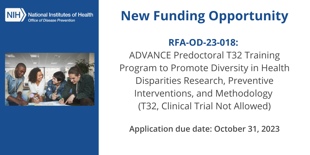 The National Institutes of Health (NIH) Office of Disease Prevention (ODP) and participating Institutes, Centers, and Offices are inviting applications to develop ADVANCE T32 programs to train predoctoral scholars from diverse backgrounds in all three of the following areas: