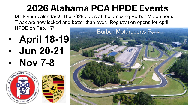 Alabama PCA will host a Car Control Clinic (CCC) on Saturday, February 28th, 2026. This is a great opportunity for members to safely explore the full potential of their vehicles (limited to Porsche cars) to improve their driving skills. The focus is to learn solid car control principles, load transfer, vehicle dynamics, manage inputs, understanding how tires reacts when pushed to the edge. And to be better, safer drivers. The program is intended to complement and enhance our existing High Performance Driver’s Education (HPDE) programs in a safe and non-intimidating, fun environment. Event will be held at the fabulous Barber Motorsports Park Proving Grounds, adjacent to the track. This facility is amazing if you have not had the opportunity to see it. Now you can! Featured Drills: 1 classroom session, two rotations on Skid pad, Figure 8, Slalom/autocross, Threshold and trail braking. Program will run with 4 groups of 5 vehicles, capped at 22 total drivers. Registrations will be awarded on first come basis for Porsche vehicles only. Cost is $375 per driver, which includes lunch at the event. This is a full day event: drivers will check in at 7:00 am and event wrap up around 5:15pm Reach out to our HPDE Chair, Tim Thornton if you have questions.