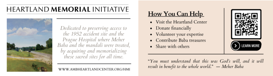 This year we will honor the anniversary of Meher Baba’s 1952 accident with both a virtual and an in-person Sahavas at the Heartland Center. On May 24th our virtual program will be Zoomed worldwide from 7 to 9 pm EDT, so please mark your calendars.