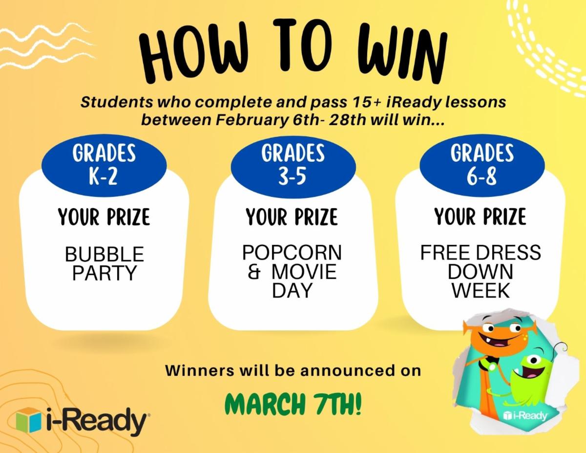 We hope to incentivize and reward students who continue to put their best foot forward and work towards proficiency on their i-Ready MyPath and teacher assigned lessons. For every student who completes and passes 15 lessons (or more) within this time frame, they will qualify for the following rewards: