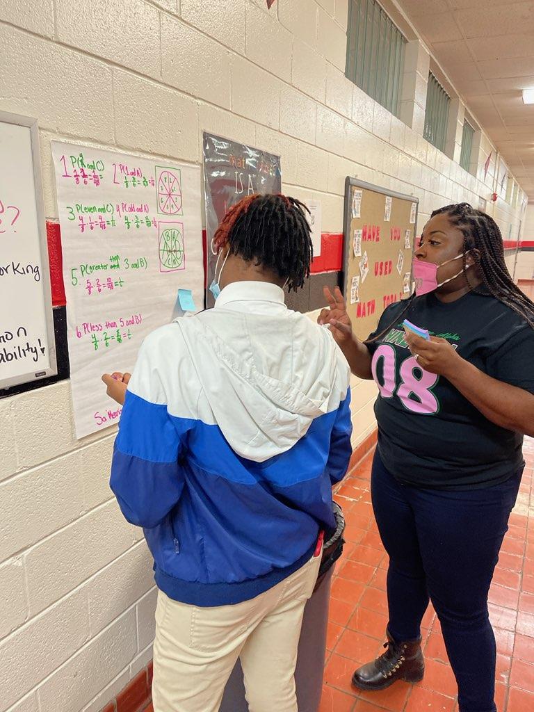 Southside High School teacher providing feedback to students during a gallery walk,