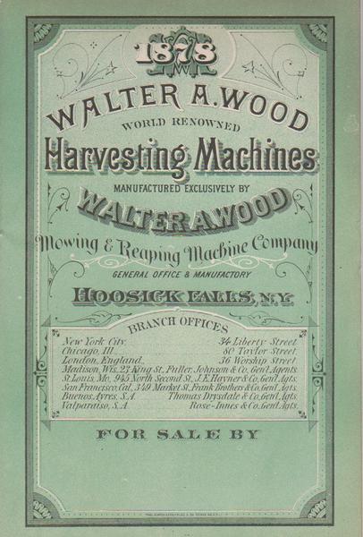 25). (Trade Catalog) Wood, Walter. 1878 WALTER A. WOOD WORLD RENOWNED HARVESTING MACHINES MANUFACTURED EXCLUSIVELY BY WALTER A. WOOD MOWING AND REAPING MACHINE COMPANY. 1878. 16 pgs. Pict .wraps, illus., info, 25th annual circular, vg cond.