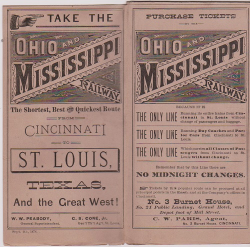 17). (Texas) TAKE THE OHIO AND MISSISSIPPI RAILWAY. The Shortest, Best and Quickest Route From CINCINNATI TO ST. LOUIS, TEXAS, AND THE GREAT WEST. Sept. 4th, 1878. 8 pg. double foldout. Schedules for the Cincinnati and St. Louis Short Line. Obverse Map titled MAP OF THE GREAT AIR LINE ROUTE, OHIO AND MISSISSIPPI RAILWAY AND CONNECTIONS. Very fine cond.
