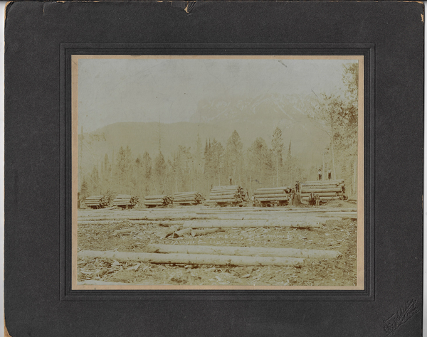 21). (British Columbia - Canada) TRAIN OF LOGS. Identified on the photo as "Train of Logs No. 3 Camp Elk Lbr. Co. Hosmer B.C. F.G. Waters, Supt; E.S. Worth, Foreman and C. Bomford Book R The photo is 10 x 8 inches and mounted on a 14 1/2 x 12 card which retains the logo of J. Spalding on the lower right corner of the mounting card. According to the Fernie, British Columbia web page, "His photographs meticulously portray the pride, prosperity, and poverty that defined Fernie in its early years. On the railway, in the forests, on the river, and in the mines, he photographed men working, building, and forging the future. Spalding’s pictures tell the story of the birth of a community and how society—elephants and all—developed in this far-flung corner of the Canadian promised land. In 1905 he bought an established studio from A.W. Prest. He worked hard to offer every photographic service possible including portraiture with ‘fancy lighting’ and postcard images of the local landscape that he was proud to call “...the finest scenery there is in the whole of the North American continent". Joseph Spalding was a well-respected member of the business community. He was the Tourism Commissioner for the Tourist Association of Southern Alberta and Southeastern British Columbia, publishing the official Automobile Road Guide to British Columbia, Alberta, and Saskatchewan, covering ‘twenty thousand miles of roads.’ Spalding left the Elk Valley to re-establish himself in Vancouver in 1925, operating several successful businesses there. He died in Vancouver after a long and illustrious career on February 11, 1958, aged 80." An abrasion at top center of card. Contrast is quite good with snowy mountains in the background.