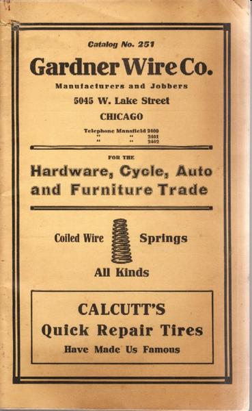 5). (Trade Catalog) GARDNER WIRE CO. FOR THE HARDWARE, CYCLE, AUTO AND FURNITURE TRADE. COILED WIRE SPRINGS - ALL KINDS, CALCUTT'S QUICK REPAIR TIRES HAVE MADE US FAMOUS. CATALOG NO. 251. Pict. wraps, March 1925.60 pgs. Index, illus., weights, sizes, cost. Discount slip laid in. Vg cond.