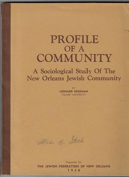 14). (New Orleans - Jewish Community) Reissman, Leonard. PROFILE OF A COMMUNITY. A SOCIOLOGICAL STUDY OF THE NEW ORLEANS JEWISH COMMUNITY. Prepared for THE JEWISH FEDERATION OF NEW ORLEANS. 1st. 1958. Printed wraps. 144 pgs. Contents include information of Residential Stability and Mobility; Participation in the Jewish Community; Community Needs and Community Services and Jewish Identifications. Tables, distribution charts, etc. Vg cond.