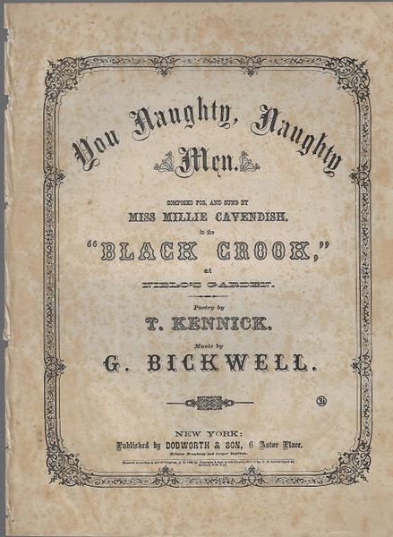 8). (Afro-American Sheet Music) Kennick, T. YOU NAUGHTY, NAUGHTY MEN. Composed for, and sung by Miss Millie Cavendish in the "BLACK CROOK," at Niblo's Garden. Poetry by T. Kennick. Music by G. Bickwell. Pub. by Dodworth and Son. 1866. 4 pgs. Dbd. Minor toning, overall in vg cond. "THE BLACK COOK is a work of musical theatre first produced at the Niblo Garden in New York, Many writers have felt that this is the first popular piece that conforms to the modern notion of a musical. Many of the song in the "Black Crook" were adaptations, but YOU NAUGHTY, NAUGHTY MEN was composed especially for the theatre. The story is a Faustian melodramatic romantic comedy, bu the production became famous for its spectacular special effects and skimpy costumes. It opened at Niblo's Garden on Broadway on September 12, 1868 and ran for a record-breaking 474 performances. (Wikipedia)