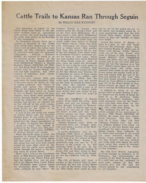 23). (Texas) Weinert, Willie Mae. CATTLE TRAILS TO KANSAS RAN THROUGH SEQUIN. Nd. c. 1930’s (?). Detailing the connections between Seguin, (Texas?) and the cattle trails to Kansas, in connection with a historical marker the city was to erect. Weinert is the author of Historic Sketches, Central Seguin 1838-1938, published in 1938, as well as Authentic History of Guadalupe County, which was published in Seguin in 1951. An ephemeral item of a type that has rarely survived.