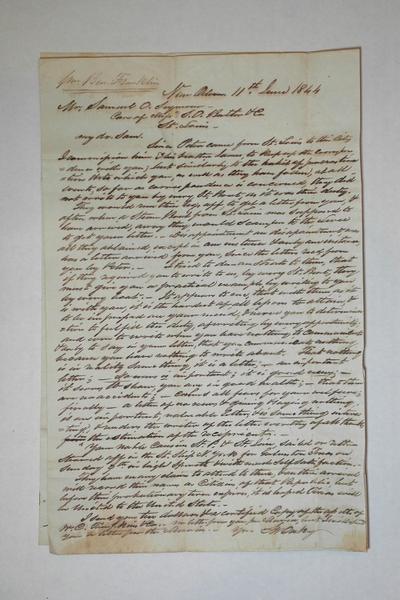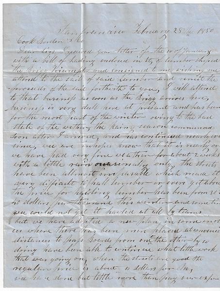Dear Sir, I received your letter of the 10 of January with a bill of lading enclosed in it, of lumber shipped on the Brigg Triumph and consignment to me wishing me to attend to the ____ of ____ Lumber and remit the proceeds of the said forthwith to you, I will attend to that businefs as soon as the Brigg arrives here, businefs is very dull here at present and has been for the most part of the winter owing to the bad state of the wether, the rainy season commenced Soon after I arrived, and has continued nearly ever since, we are in hopes know that it is nearly over we have had very fine weather for about 2 weeks with a little rain occasionally only, the streets have been allmost impassable which made it very difficult to haull lumber or even get about, the price for hauling lumber has been from 30 to 40 dollars per thousand this winter and sometimes we could not get it hauled at all by teams but we have adopted a new plan in some instances where there has been men placed at convenient distance to pass boards from one to the other, by so doing have been able to continue what little work was going on. When the streets are good the regular price is about 10 dollars per m. We have done but little more than pay our expenses here this winter. The town is full of carpenters and wages is a getting down some what carpenters can be had at this time say from 6 to 12 dollars per day. Money is worth 10 percent per month and scarce at that but it is thought will be plentyer as soon as the miners begin to come down, and they have continued coming with their piles, some are going home in the next steamer, others will leave their gold here and return to the mines from the best information I can get the miners have done very well this winter. I meen those that have actually worked, not those that have been idling their time away prospecting and gambling but those that actually work, the workers have everaged this winter on the dry digings about one ounce per day. There is a great rush at this time for the mines, and we think of going as soon as the Mary Mitchel arrives and we shall have made sail of our lumber. The Chesapeake Capt. Marvell has arrived, her passage from home was 146 days, sailing days 130. She has lost 2 of her passengers George Benet and Benjamin Marble, George Benet died 3 days out, Benjamin Marble died 2 days before the schoner arrived and was brought in and buried on shore and I was present at the funeral , the rest of her company are all well they have not broke up yet but probably will as soon as they have disposed of their Cargo and settled up their acounts. They have made sail of their lumber at 65 dollars per thousand, laded on the shore and have sold their chees one cast at 60 cts the balance at 40 cts. The chees was the hansomest that has been in market and in first rate order, but the packages to large for the miners chees should be put up in boxes weighing from 15 to 20 lbs, that being about the quantity that miners wish to perchase. Lumber is worth from 75 to 125 dollars per thousand and a large quantity in the market and daily arivings, weeks before last that was rising of three Million arrived and more or lefs daily continues to come. The Mary Mitchell will not probably get here in lefs than a month from this time and possibly lumber will be higher before that time.
