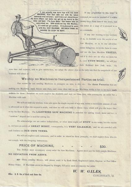 6). (Trade Catalog) Giles, W.W. advertisement letter for the “Lightning Saw Horse” which Giles advertised in the “American Agriculturist”. During the second half of the 19th century there were numerous attempts to mechanize the sawing of logs through a faster cutting machine. Many such inventions were based on changing the rotary motion of a hand crank or belt pulley into the reciprocating action of a cross-cut saw. This plan led to the gas engine powered drag saws of the 20th century. However, a more interesting group of inventions were those that depended on a moving lever or a combination of levers and foot pedals or even a treadle to power the saw. Many of these machines were lighter than the rotary power machines and were made to fold up to carry through the woods. They could be converted on the spot to saw horizontally to fell a tree or to saw vertically to cut the stem into lumber length logs or short rounds for firewood. Such saws were marketed primarily to farmers who had to cut a firewood supply each year in addition to filling their need for fence posts and lumber. Among these inventions was that of William Giles, of Cincinnati who in 1879 advertised his patented saw in the “American Agriculturist” His “Lightning Saw Horse” was claimed to saw off a 2 foot log in 2 minutes. The farmer in the below advertisement riding the “Lightning Saw Machine” is expounding to the potential customer “I can actually saw more logs with this SAW MACHINE, then four men can with the latest improved cross-cut saws; and it does not almost break my back either, nor make me get on my knees in the snow and mud. I’ve been there. You lumber men all understand me. $100 would not buy this Machine, if I could not get another. It is pleasant to work with this SAW MACHINE. NO SUCH THING AS HAVING TO STOP TO REST.” (American Artifacts – issue 52, Sept/Oct 2000) Vg cond.