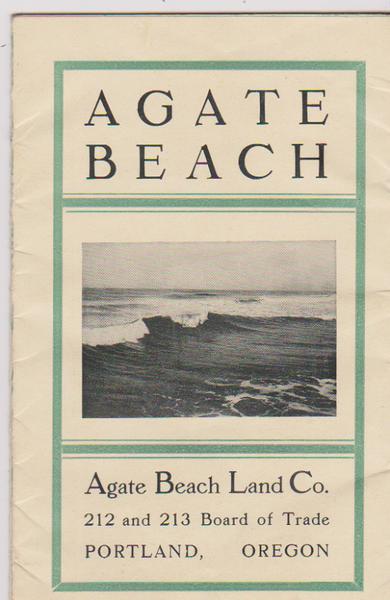 10). (Oregon) Mackey, Samuel P. and Frank A. Knapp. AGATE BEACH. Agate Beach Land Co. Promotional souvenir brochure. Portland, OR: Agate Beach Land Co., 212 & 213 Board of Trade, Made by Glass & Prudhomme Co., c. 1910. 16mo. 3.25 x 5.5 in., 32 pp (unpaginated). Accordion-style, which opens up into 16 panels 27.25 in. long, by 5.5 in., w/ photo illust. on front cover, w/ 6 photo illustrations. VG copy designed to be mailed as postcard mailer. First edition of this very scarce land promotion prospectus for the Agate Beach Land Co. which was building a 630 acre real estate development and resort on the Oregon Coast with daily bus service and automobile trips from nearby Newport, OR. The two developers built a 42-room hotel, erected stores, and boarding houses, and were selling lots of 50 x 100 feet, and erecting summer vacation cottages. The images in this prospectus show the newly graded boulevard, a completed farm house, the sweeping views, bathing grounds, and the light house. There are two different versions of this real estate piece, this being the earlier version with photos of the surroundings, and the potential. Worldcat locates 2 copies of this edition.