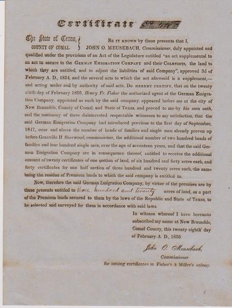 11). (Texas) Meusebach, John O. CERTIFICATE. THE STATE OF TEXAS, COUNTY OF COMAL. BE IT KNOWN BY THESE PRESENTS THAT I, JOHN O. MEUSEBACH, COMMISSIONER, DULY APPOINTED AND QUALIFIED UNDER THE PROVISIONS OF AN ACT OF THE LEGISLATURE.... New Braunfels. Feb. 28, 1855. 1 page, accomplished in manuscript, very light toning and in vg cond.