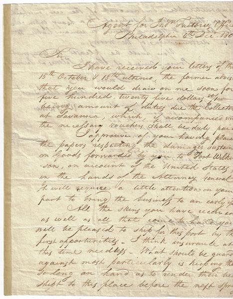 7). (Trading with Indians) Irvine, William. A two page letter dated December 6th, 1801 sent by William Irvine, the agent for India Factories Office to Joseph Clay, a trader with various Indian tribes. The letter is concerned with Clay’s shipping of “all the skins you have received.”