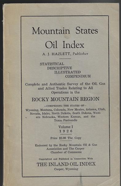 12). (Oil) MOUNTAIN STATES OIL INDEX. STATISTICAL DESCRIPTIVE ILLUSTRATED COMPENDIUM. COMPLETE AND AUTHENTIC SURVEY OF THE OIL, GAS AND ALLIED TRADES RELATING TO ALL OPERATIONS IN THE ROCKY MOUNTAIN REGION, COMPRISING THE STATE OF WYOMING, MONTANA, COLORADO, NEW MEXICO, ARIZONA, UTAH, NEVADA, IDAHO, NORTH DAKOTA, SOUTH DAKOTA, WESTERN NEBRASKA, WESTERN KANSAS AND THE TEXAS PANHANDLE. A.J. Hazlett, Publisher. Vol. 1 of what was intended to be an annual directory, but evidently the only edition published. 1st. 1926. Printed wraps.106 pgs. As the publisher proclaims on the first page, “This book is a gusher of information.” It provides an alphabetical listing of more that 750 oil and gas producing companies, refineries, natural gas plants, marketing companies, supply houses, carbon black works, brokerage firms, etc, in the states across the Rockies, Southwest, and Plains. Each listing includes the company name and address(es), amount of capital authorized and issued, par value, state of incorporation, , officers, and locations of principal properties. There is also a statistical table with information on pipelines, refineries and production in Wyoming, Montana and the Rockies. Advertisements. Vg cond. Rare, OCLC list only two copies.