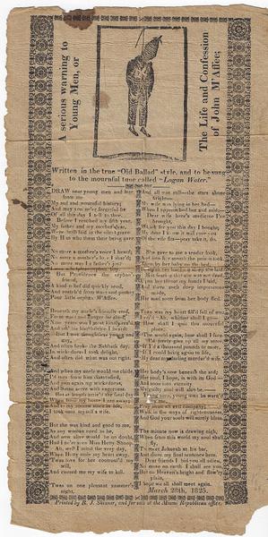 The folk ballad is among the earliest Anglo-American musical traditions, having deep roots in the oral, vernacular cultures of England, Scotland, Ireland, and Wales. With the advent of cheap paper in the early 16th century, balladry was expanded by the profusion of published broadsides and broadsheets, which opened a new mode of communication in literary, printed contexts. Yet each format--the spoken and the printed word--would later develop in tandem, as many traditional folk ballads found their way into print and some broadside ballads took root in folk tradition. Like most of the genre, this rare broadside ballad, “A Serious Warning to Young Men, or The Life and Confession of John M’Affee,” is based on an actual event, in this case the execution of the titular character at Dayton, Ohio, in 1825 for the murder of his wife. Less commonly, though, the ballad of John McAffee, under the title “McAfee’s Confession” or “Murdered Wife,” would become one of the most widespread spoken word ballads of the 19th century, with versions of its lyrics recorded by folklorists from Virginia to Iowa and Missouri. Printed at Dayton on the occasion of the actual McAffee’s hanging, this striking broadside not only contains the original composition, but is the only printed version of the ballad to appear until the early 20th century. Known in only two other copies, it is the earliest broadside ballad printed in the trans-Allegheny West.