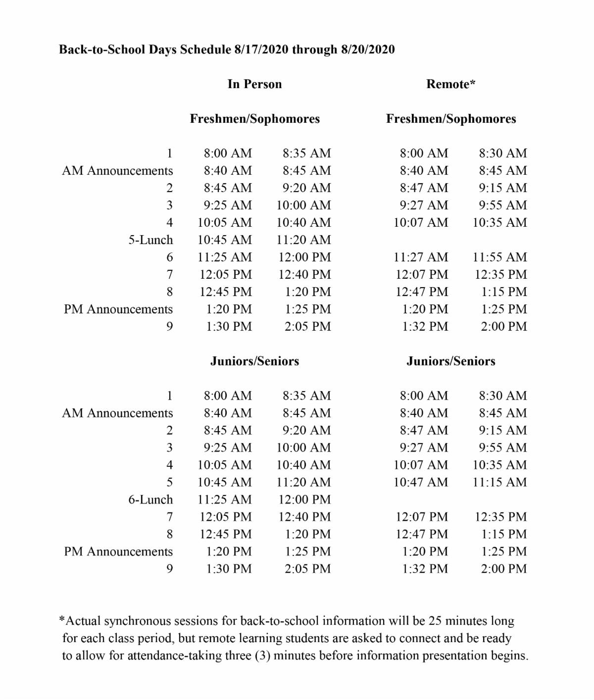 The bell schedule for our Back-to-School Days (8/17/2020 through 8/20/2020) is included below. Because information will be presented every period of the day, students are asked to attend from 8:00 a.m. to 2:05 p.m. regardless of whether they have an open period/athletics 1st period or 9th period. Students who have open period/athletics period 1st or 9th period will report to the Auditorium during the Back to School Days for the session presentations during those periods.